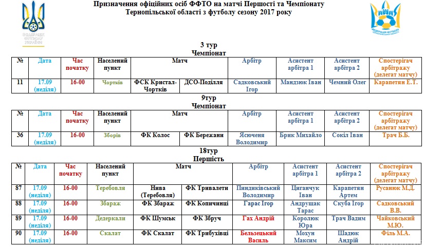 Призначення офіційних осіб ФФТО на матчі Першості та Чемпіонату Тернопільської області з футболу