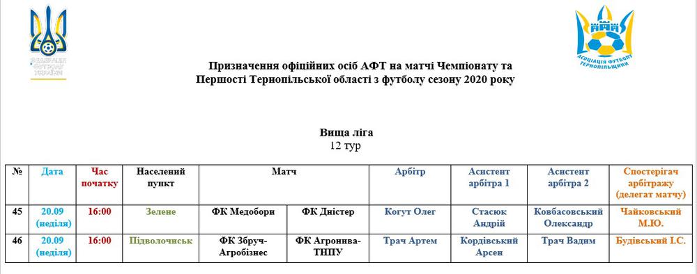 Призначення офіційних осіб АФТ на матчі 20 вересня