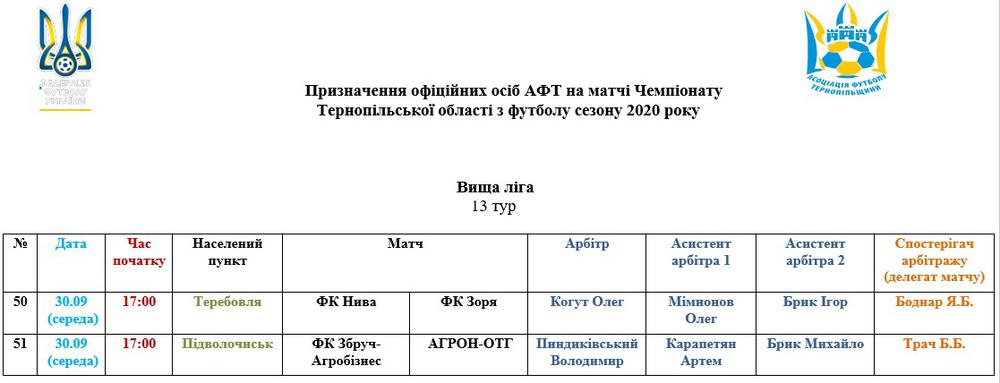 Призначення офіційних осіб АФТ на матчі 30 вересня