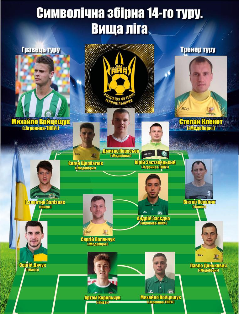 Пропонуємо до Вашої уваги символічну збірну чотирнадцятого туру вищої ліги чемпіонату Тернопільської області 2020 року за версією Асоціації футболу Тернопільщини.
