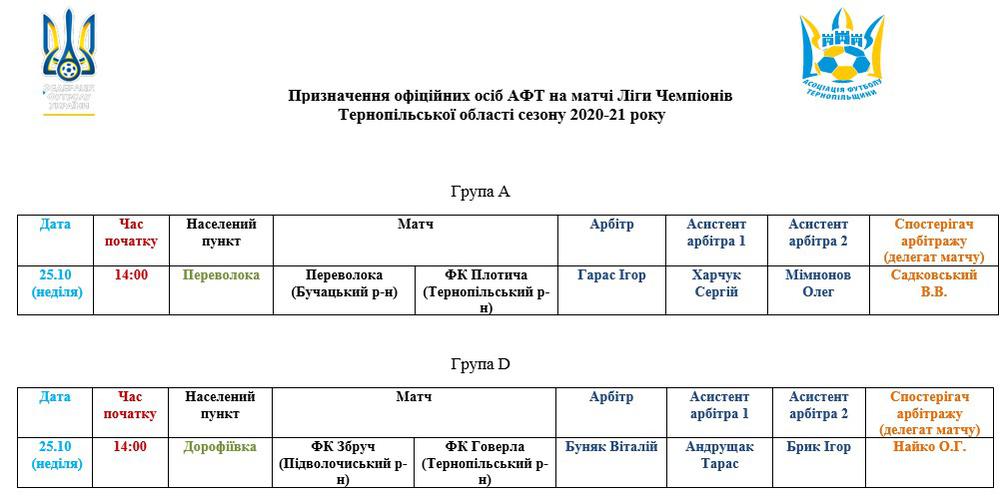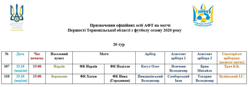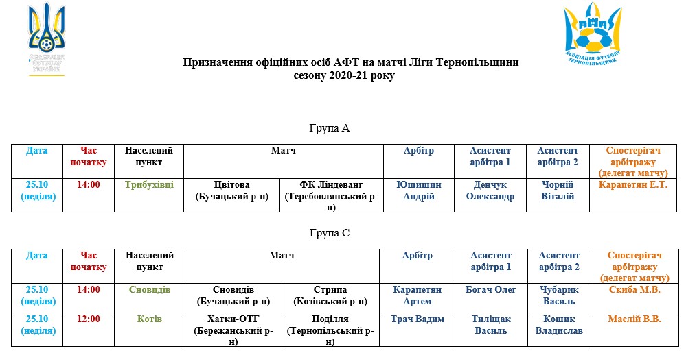 Призначення офіційних осіб АФТ на матчі 25 жовтня