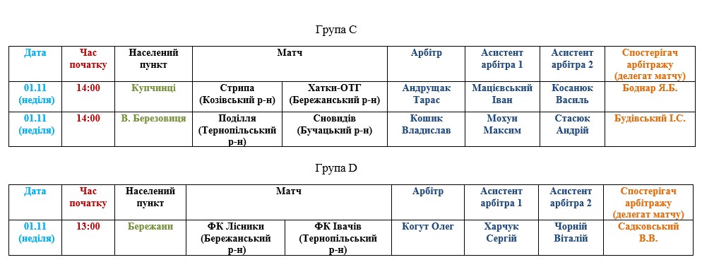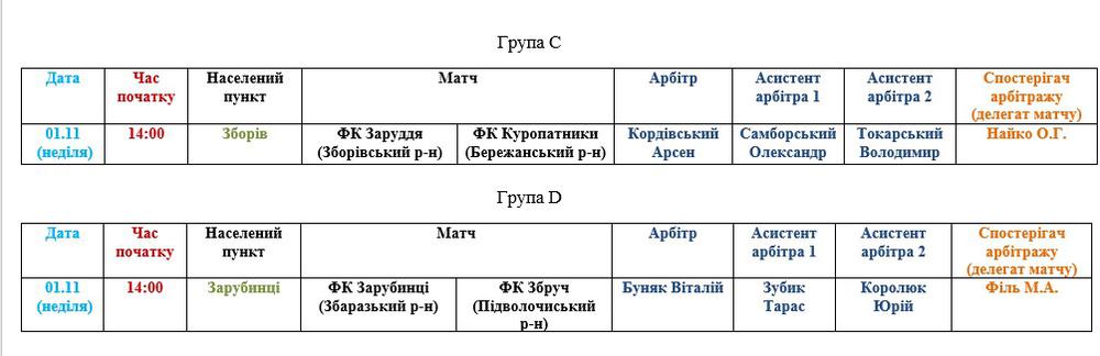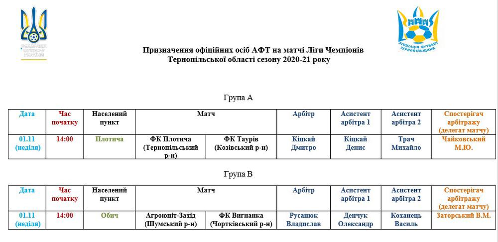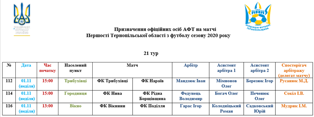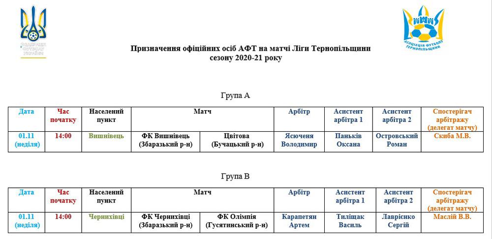Призначення офіційних осіб АФТ на матчі 01 листопада