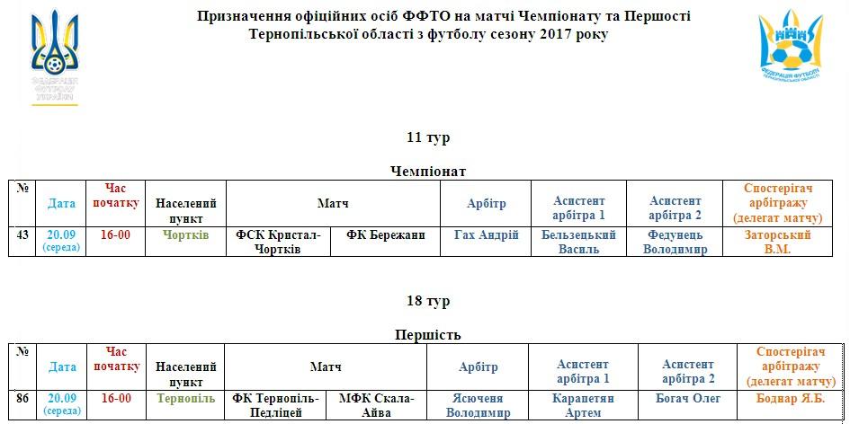 Призначення офіційних осіб ФФТО на поєдинки 20 вересня