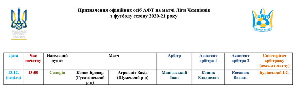 Призначення офіційних осіб АФТ на матчі 13 грудня