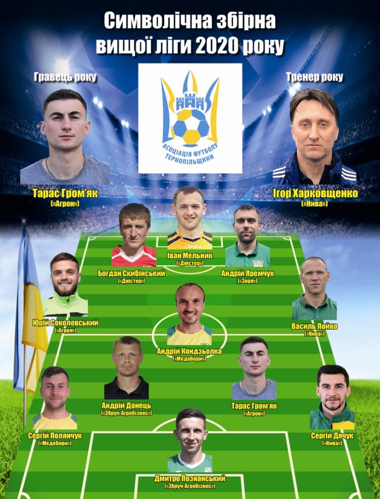 2021-01-11 15:20:40.000000На основі опитування головних тренерів і капітанів команд вищої ліги чемпіонату Тернопільської області 2020 року, а також символічних збірних, які формувалися протягом усього сезону Асоціація футболу Тернопільщини пропонує до Вашої уваги символічну збірну 2020 року (вища ліга).