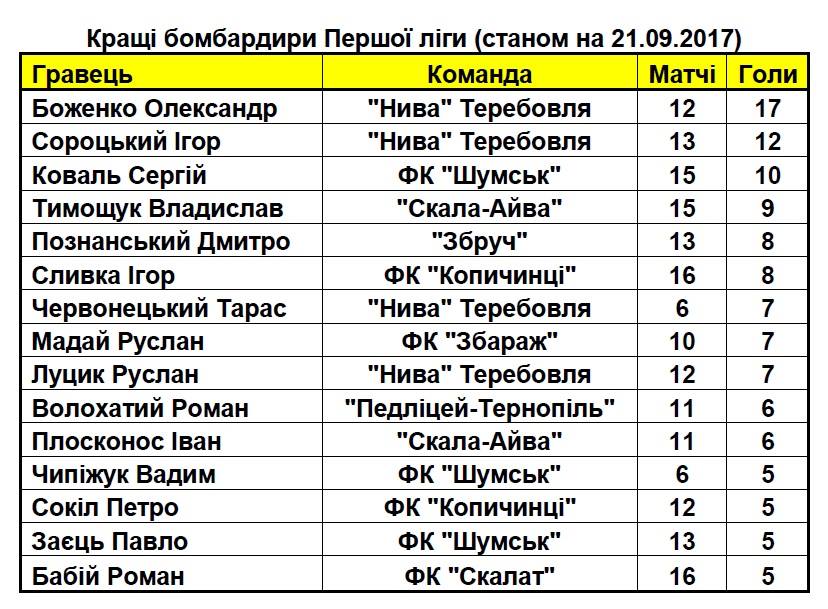 2017-09-21 13:30:27.000000Пропонуємо до Вашої уваги список кращих бомбардирів першої ліги чемпіонату Тернопільської області з футболу станом на 21 вересня.