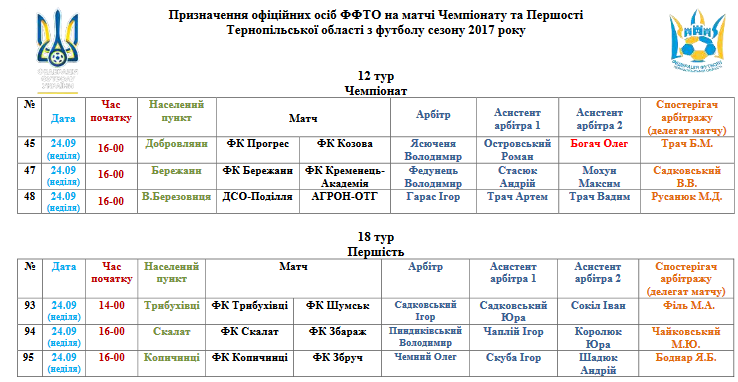Призначення офіційних осіб ФФТО на поєдинки 24 вересня (зміни)