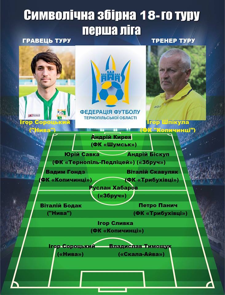 Пропонуємо до Вашої уваги символічну збірну 18-го туру першої ліги чемпіонату Тернопільської області з футболу 2017 року.