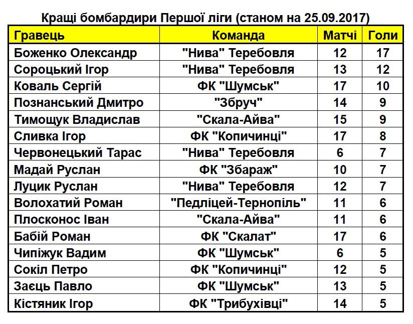 2017-09-25 17:31:25.000000Пропонуємо до Вашої уваги список кращих бомбардирів першої ліги чемпіонату Тернопільської області з футболу станом на 25 вересня.