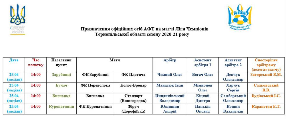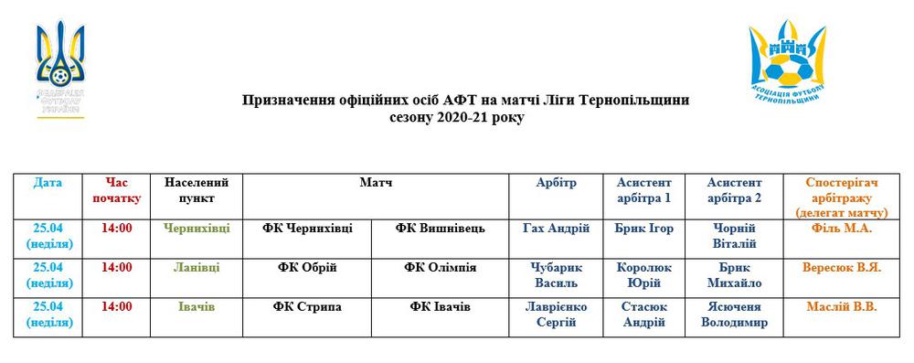 Призначення офіційних осіб АФТ на матчі 25 квітня