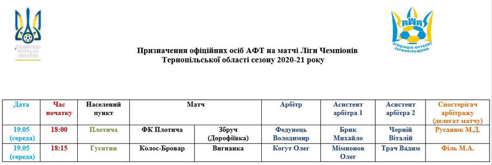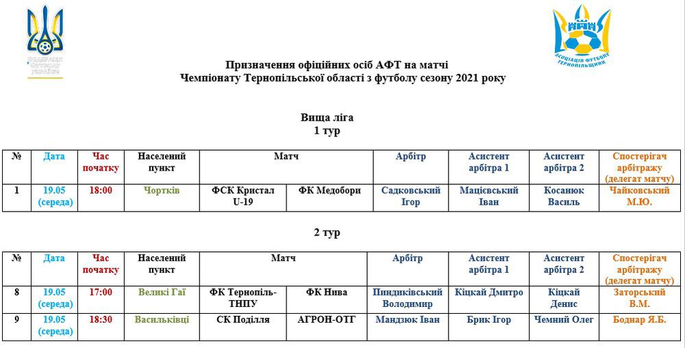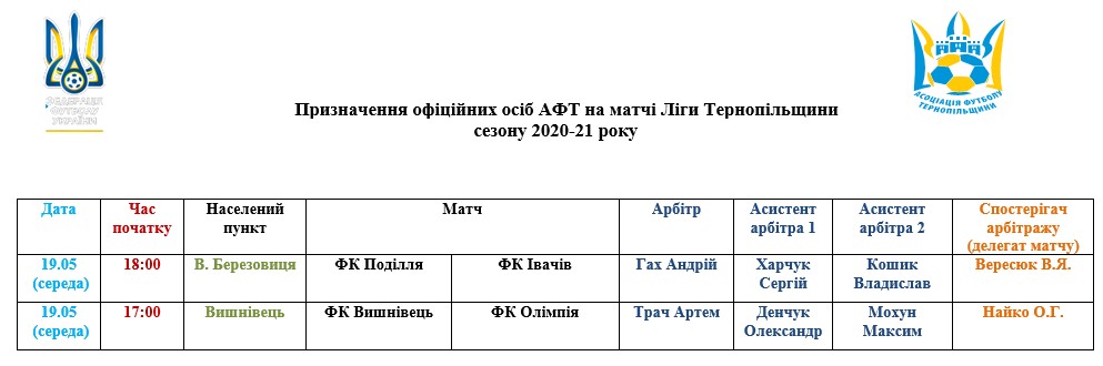 Призначення офіційних осіб АФТ на матчі 19 травня
