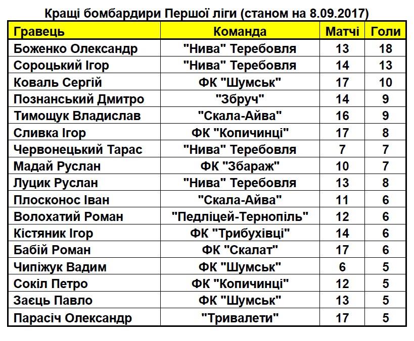 2017-09-29 10:47:57.000000Пропонуємо до Вашої уваги список кращих бомбардирів першої ліги чемпіонату Тернопільської області з футболу станом на 29 вересня.