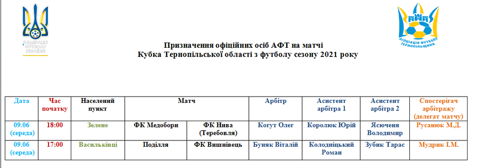 Призначення офіційних осіб АФТ на матчі 09 червня