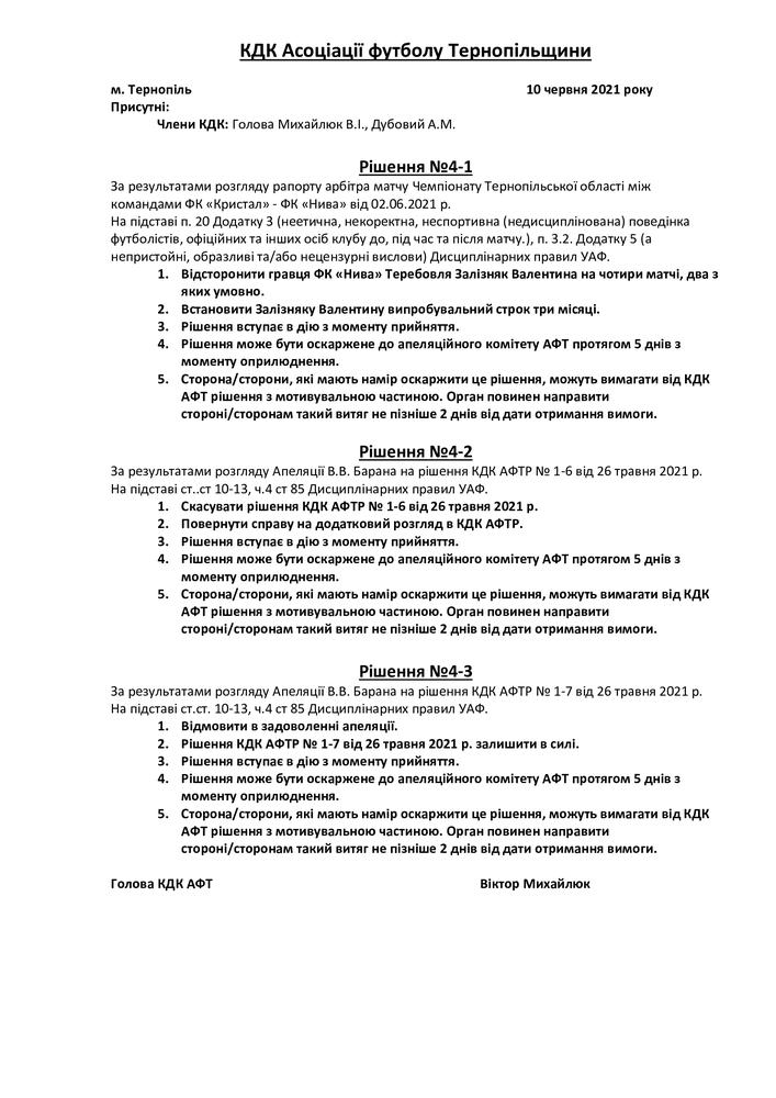 РІШЕННЯ КДК АСОЦІАЦІЇ ФУТБОЛУ ТЕРНОПІЛЬЩИНИ №4/2021