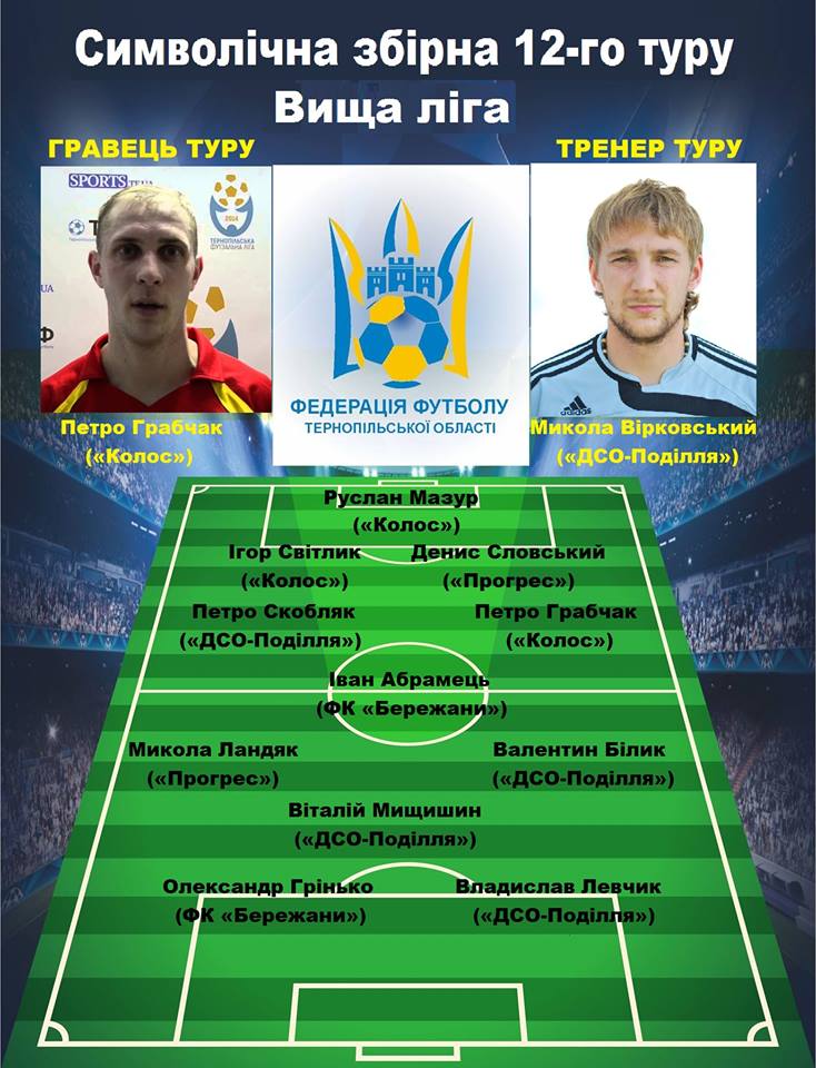 2017-09-29 20:04:22.000000Пропонуємо до Вашої уваги символічну збірну 12-го туру вищої ліги чемпіонату Тернопільської області з футболу 2017 року.