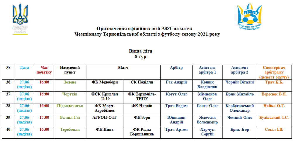 Призначення офіційних осіб АФТ на матчі 27 червня