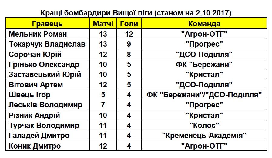 2017-10-02 15:22:10.000000Пропонуємо до Вашої уваги список кращих бомбардирів вищої ліги чемпіонату Тернопільської області з футболу станом на 2 жовтня.