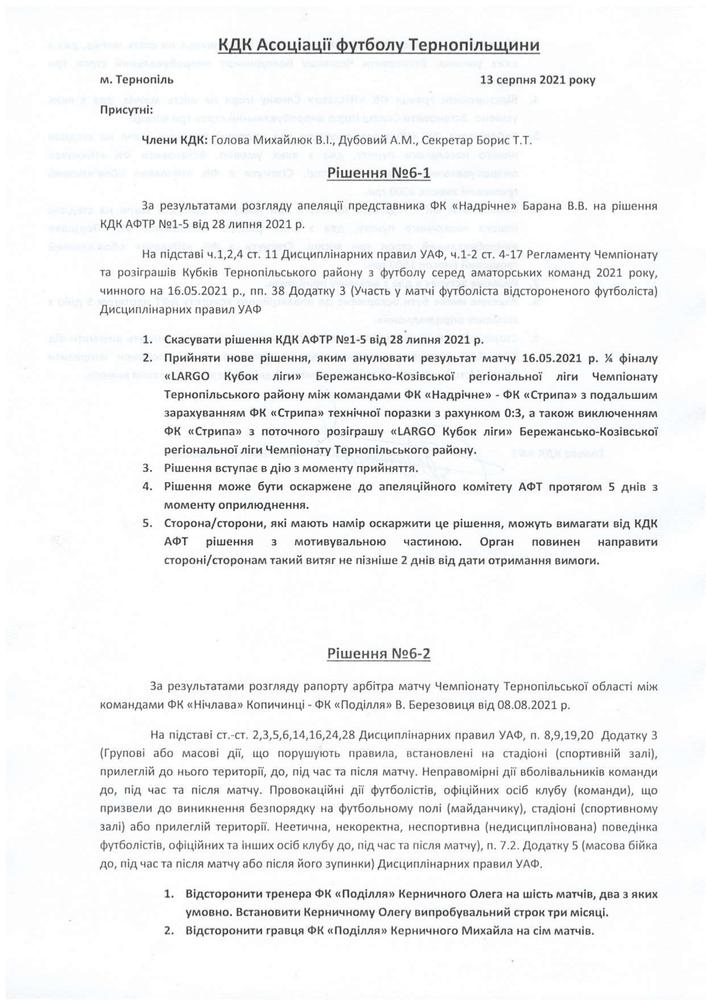 РІШЕННЯ КДК АСОЦІАЦІЇ ФУТБОЛУ ТЕРНОПІЛЬЩИНИ №6/2021