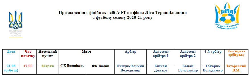 ПРИЗНАЧЕННЯ ОФІЦІЙНИХ ОСІБ АФТ НА ФІНАЛИ ЛІГИ ЧЕМПІОНІВ ТА ЛІГИ ТЕРНОПІЛЬЩИНИ