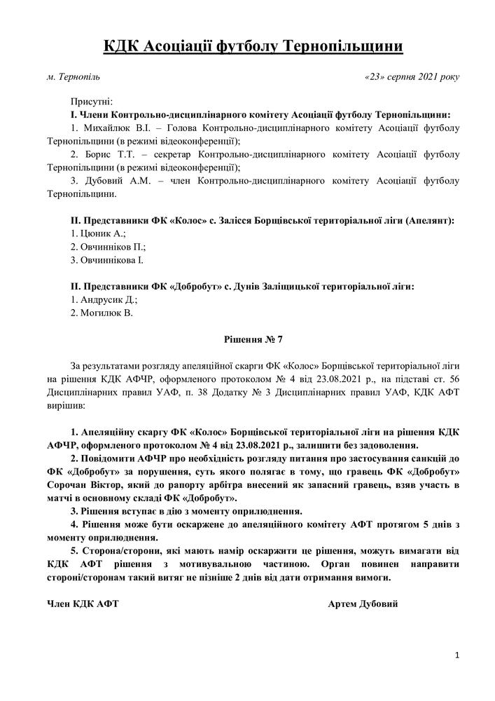 РІШЕННЯ КДК АСОЦІАЦІЇ ФУТБОЛУ ТЕРНОПІЛЬЩИНИ №7/2021