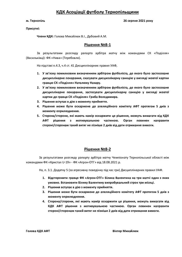 РІШЕННЯ КДК АСОЦІАЦІЇ ФУТБОЛУ ТЕРНОПІЛЬЩИНИ №8/2021