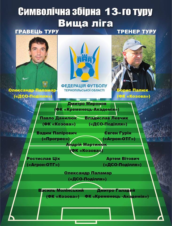 Пропонуємо до Вашої уваги символічну збірну 13-го туру вищої ліги чемпіонату Тернопільської області з футболу 2017 року.
