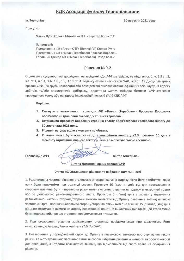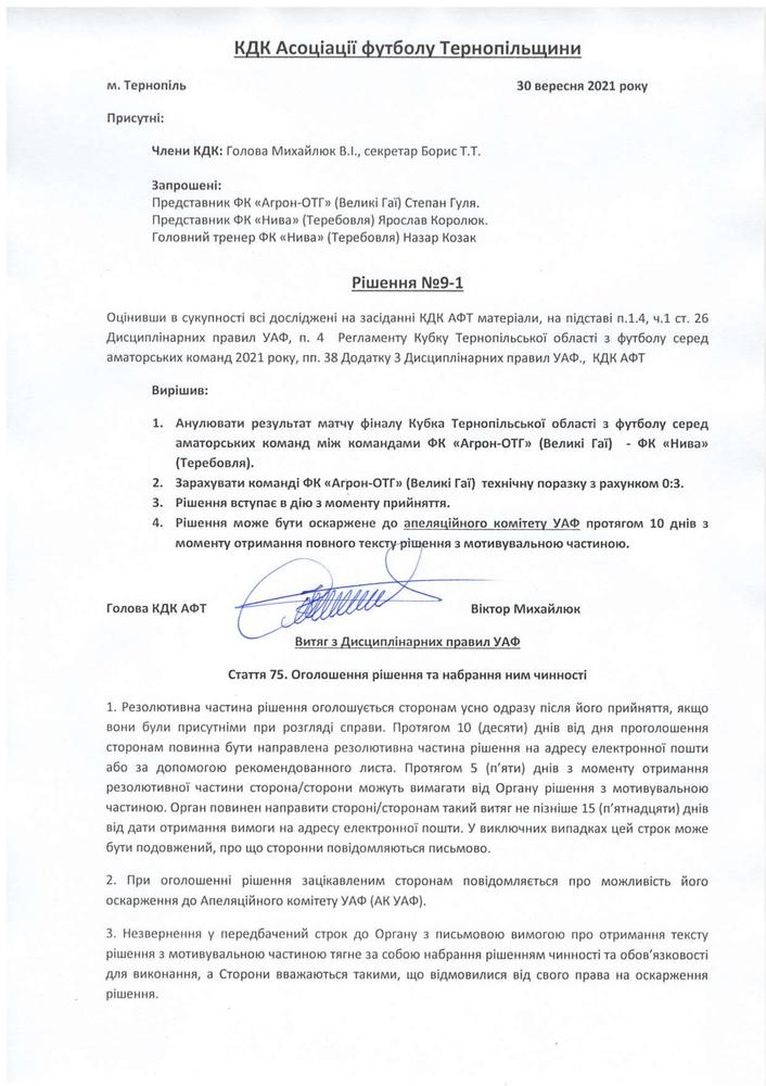 РІШЕННЯ КДК АСОЦІАЦІЇ ФУТБОЛУ ТЕРНОПІЛЬЩИНИ №9/2021
