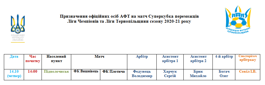 Призначення офіційних осіб АФТ на матч 14 жовтня