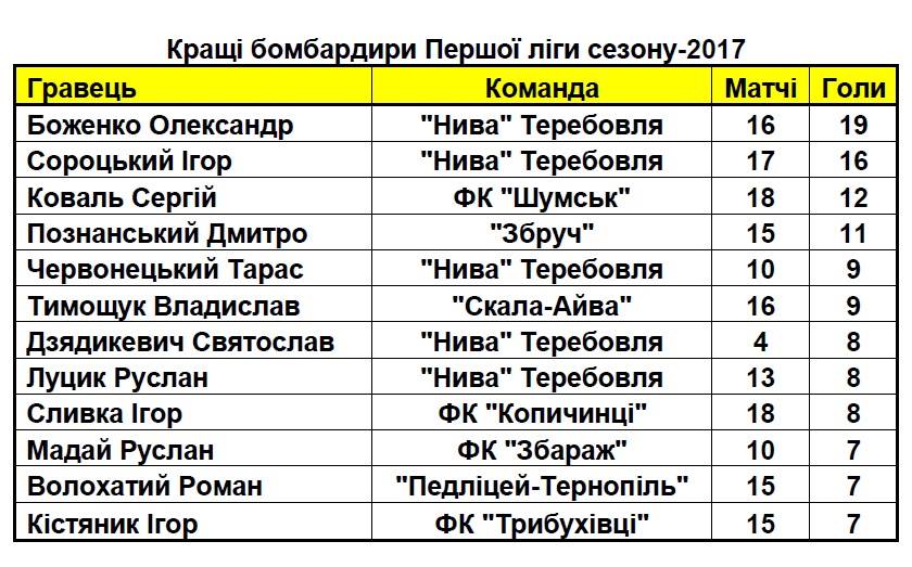2017-10-12 12:08:02.000000Пропонуємо до Вашої уваги підсумковий список кращих бомбардирів першої ліги чемпіонату Тернопільської області з футболу.