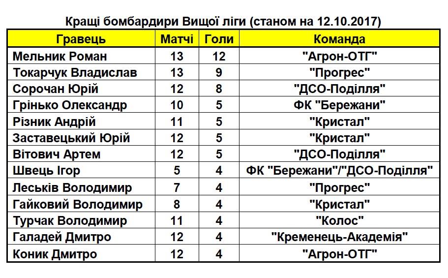 2017-10-13 09:41:20.000000Пропонуємо до Вашої уваги список кращих бомбардирів вищої ліги чемпіонату Тернопільської області з футболу станом на 12 жовтня.