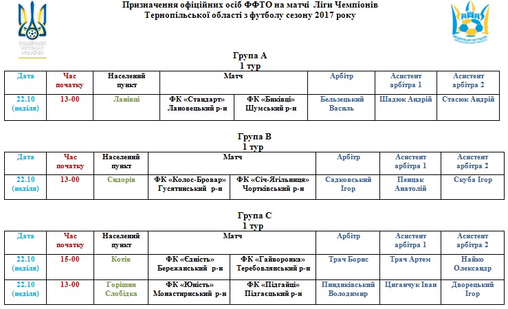 Призначення офіційних осіб ФФТО на матчі Ліги Чемпіонів Тернопільської області (зміни)