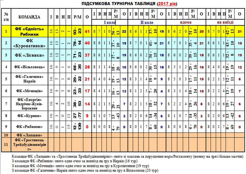 ЧЕМПІОНАТ БЕРЕЖАНСЬКОГО РАЙОНУ. ПІДСУМКОВА ТУРНІРНА ТАБЛИЦЯ
