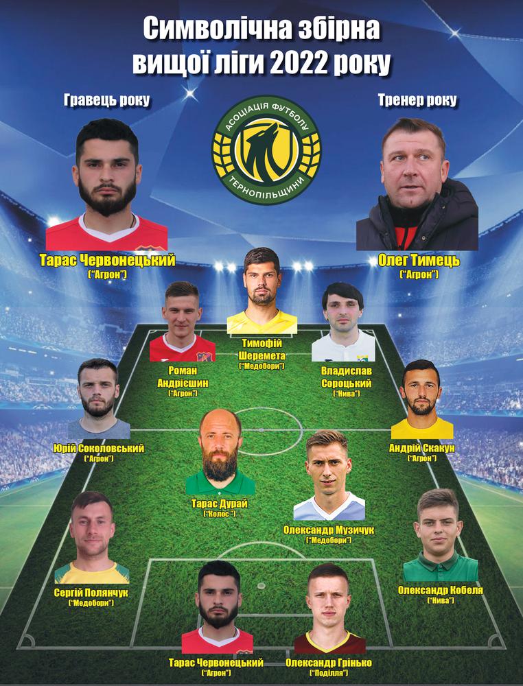 2023-02-03 10:25:47.000000На основі опитування головних тренерів і капітанів команд вищої ліги чемпіонату Тернопільської області 2022 року, а також символічних збірних, які формувалися протягом усього сезону пропонуємо до Вашої уваги символічну збірну вищої ліги 2022 року.