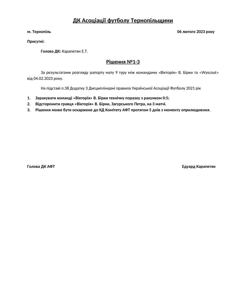 РІШЕННЯ ДК АСОЦІАЦІЇ ФУТБОЛУ ТЕРНОПІЛЬЩИНИ №1-3/2023