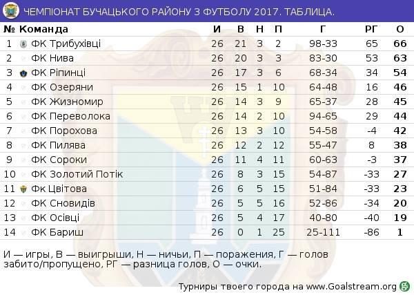 ЧЕМПІОНАТ БУЧАЦЬКОГО РАЙОНУ. ПІДСУМКОВА ТУРНІРНА ТАБЛИЦЯ