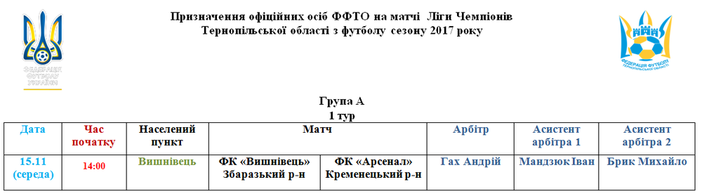 Призначення офіційних осіб ФФТО на матчі Ліги Чемпіонів Тернопільської області
