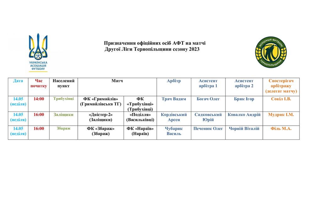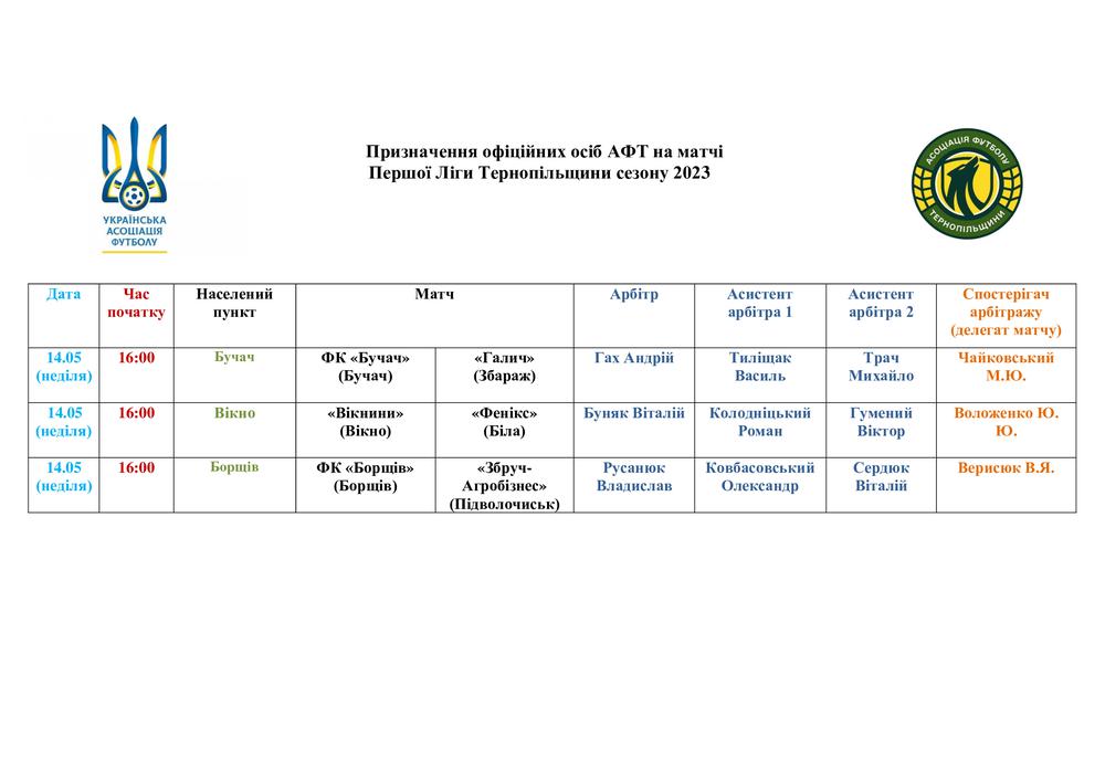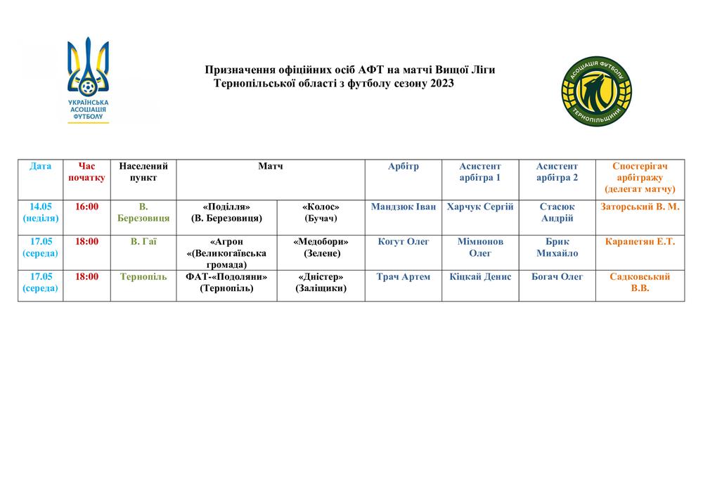 ПРИЗНАЧЕННЯ ОФІЦІЙНИХ ОСІБ АФТ НА МАТЧІ ЧЕМПІОНАТУ ТЕРНОПІЛЬСЬКОЇ ОБЛАСТІ. 14 ТА 17 ТРАВНЯ