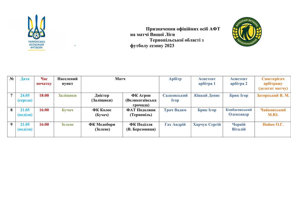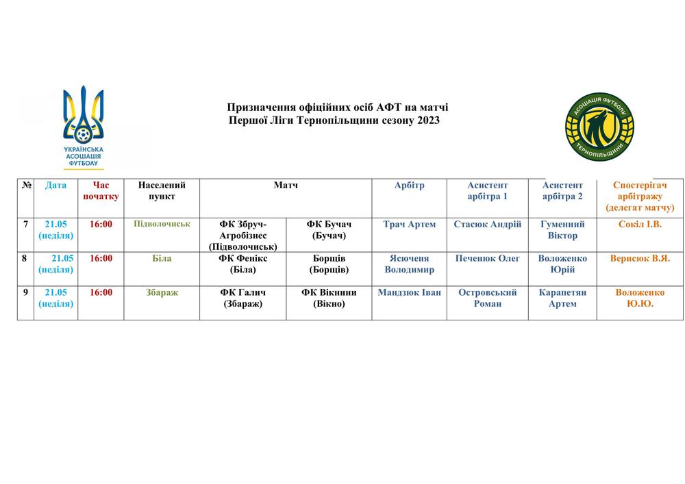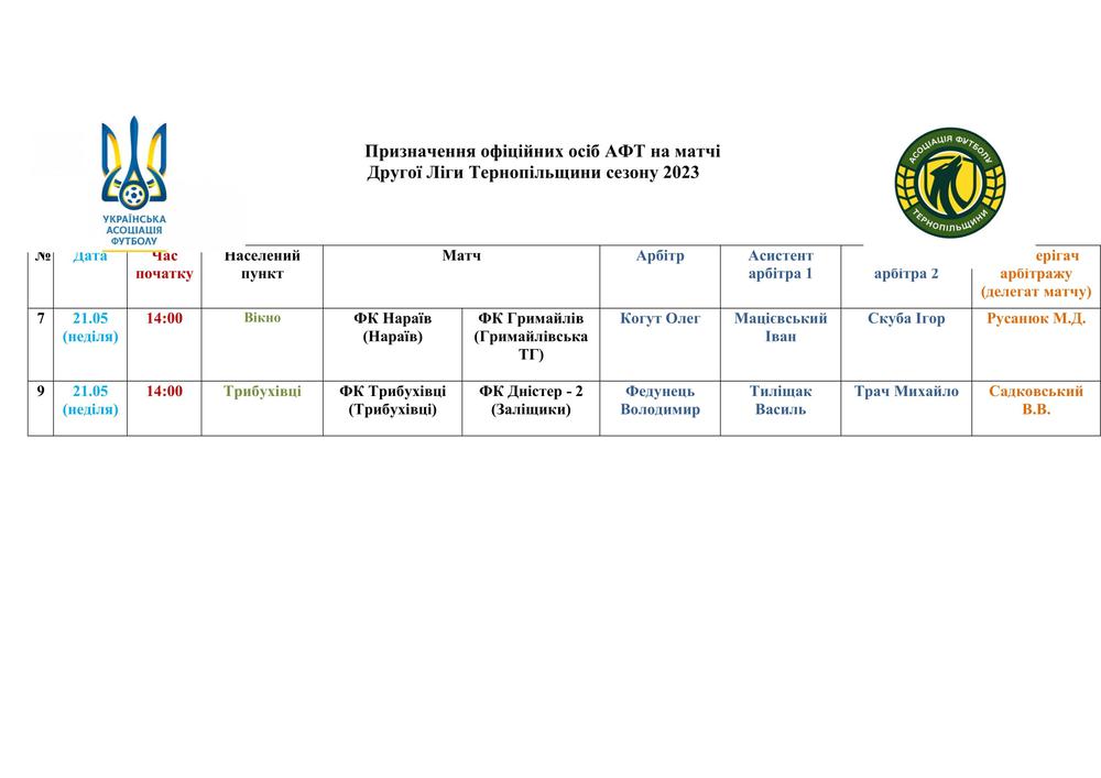 ПРИЗНАЧЕННЯ ОФІЦІЙНИХ ОСІБ АФТ НА МАТЧІ ЧЕМПІОНАТУ ТЕРНОПІЛЬСЬКОЇ ОБЛАСТІ. 21 ТРАВНЯ