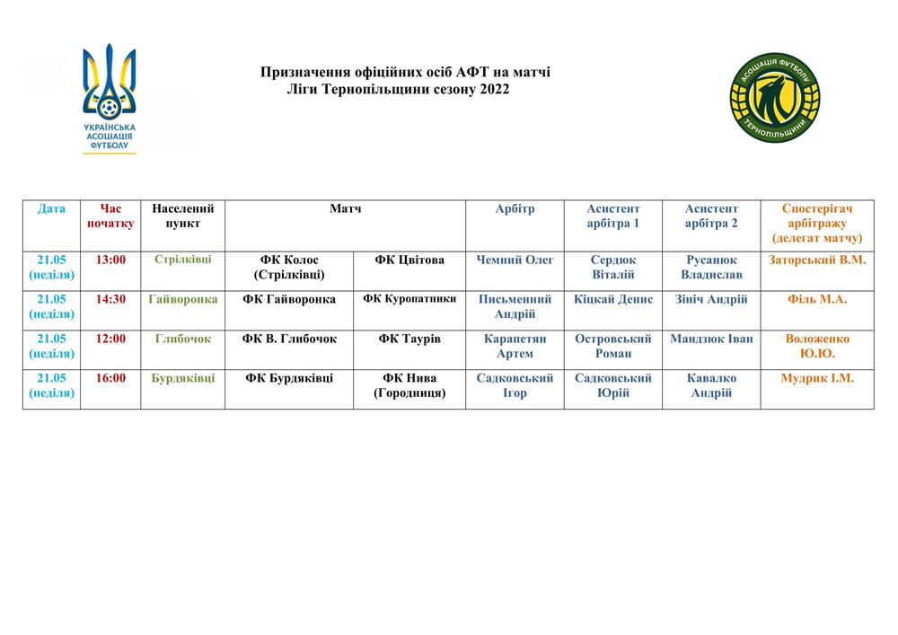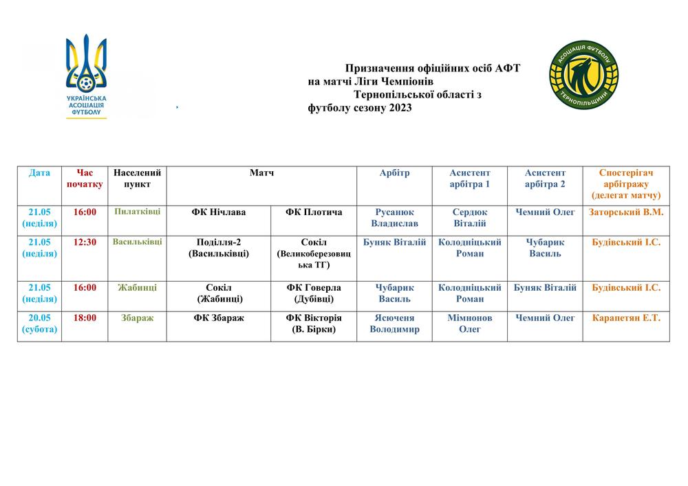 ПРИЗНАЧЕННЯ ОФІЦІЙНИХ ОСІБ АФТ НА МАТЧІ ЛІГИ ЧЕМПІОНІВ ТА ЛІГИ ТЕРНОПІЛЬЩИНИ. 21 ТРАВНЯ