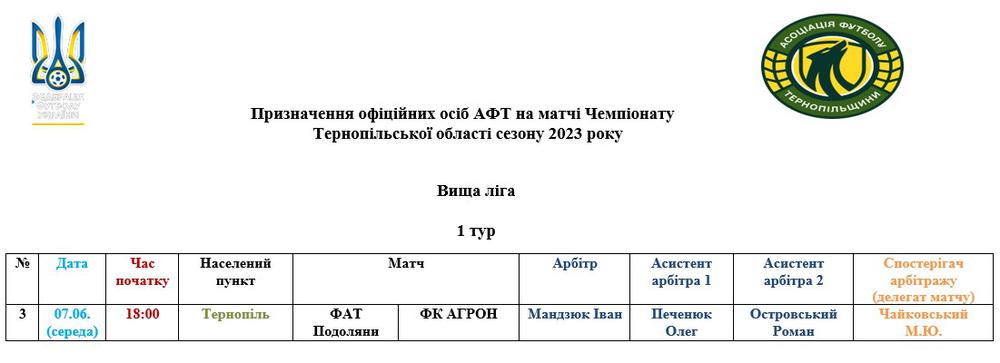 Призначення офіційних осіб АФТ на матч Чемпіонату Тернопільської області