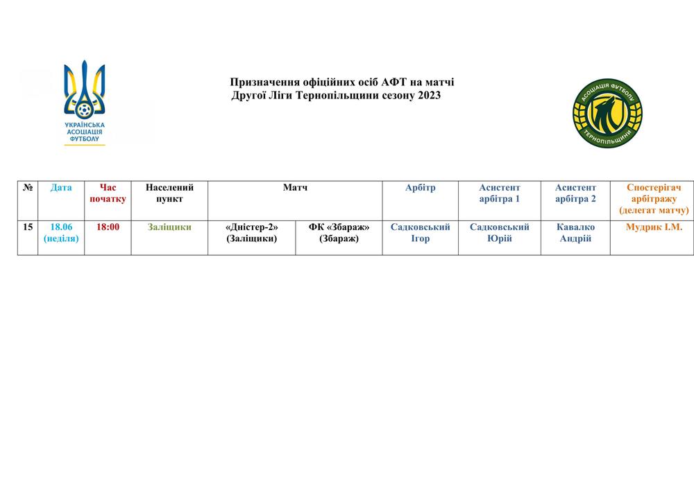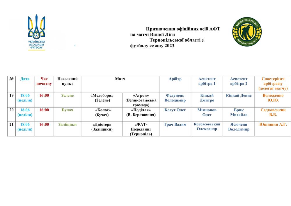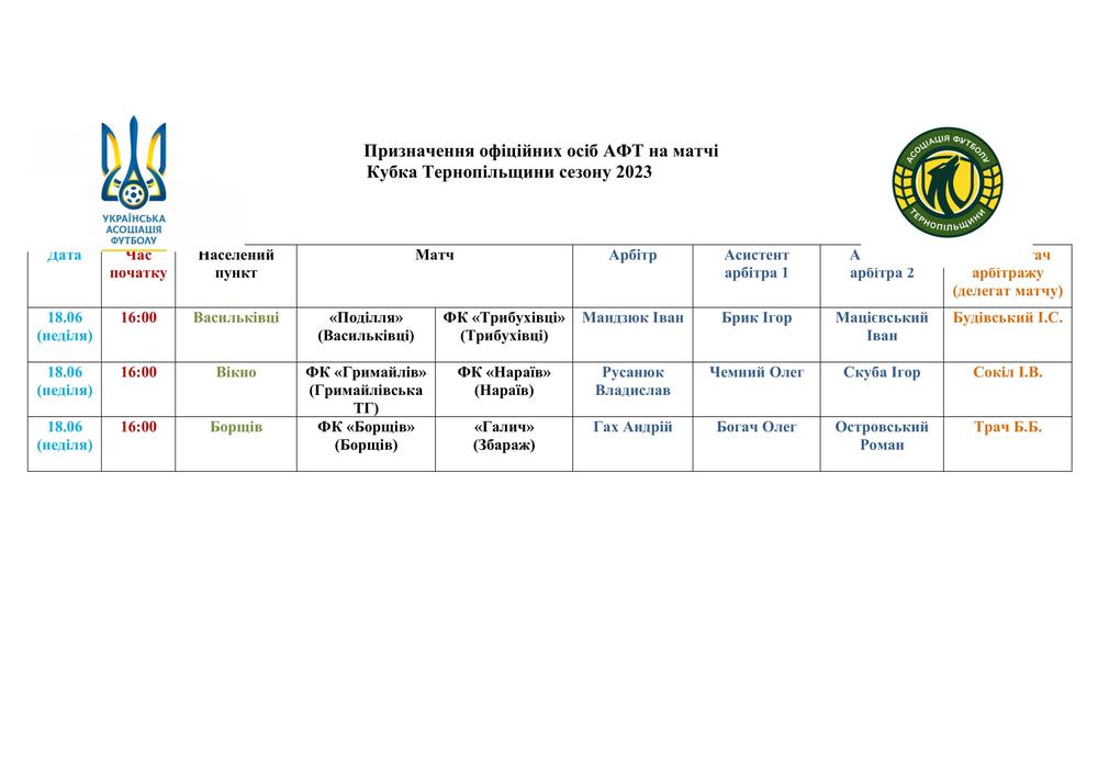 ПРИЗНАЧЕННЯ ОФІЦІЙНИХ ОСІБ АФТ НА МАТЧІ ЧЕМПІОНАТУ ТА КУБКУ ОБЛАСТІ. 18 ЧЕРВНЯ