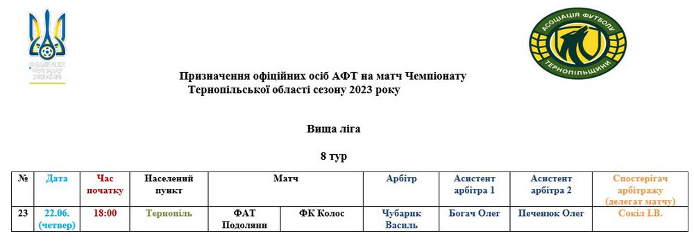 Призначення офіційних осіб АФТ на матч чемпіонату Тернопільської області. 22 червня
