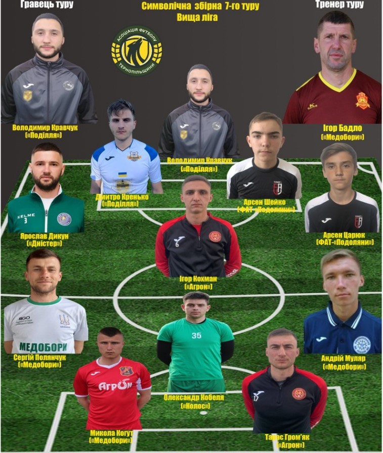 Пропонуємо до Вашої уваги символічну збірну сьомого туру вищої ліги чемпіонату Тернопільської області 2023 року за версією Асоціації футболу Тернопільщини.