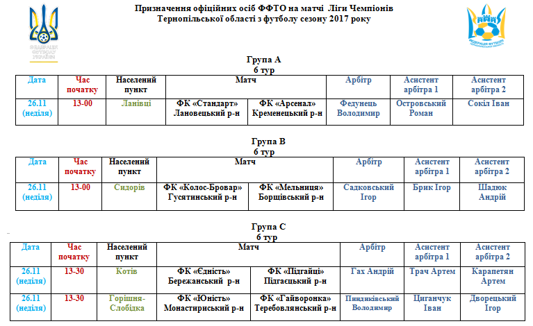 Призначення офіційних осіб ФФТО на матчі Ліги Чемпіонів Тернопільської області