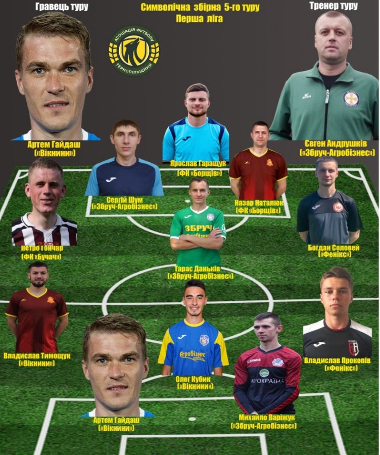 Пропонуємо до Вашої уваги символічну збірну п'ятого туру першої ліги чемпіонату Тернопільської області 2023 року за версією Асоціації футболу Тернопільщини.