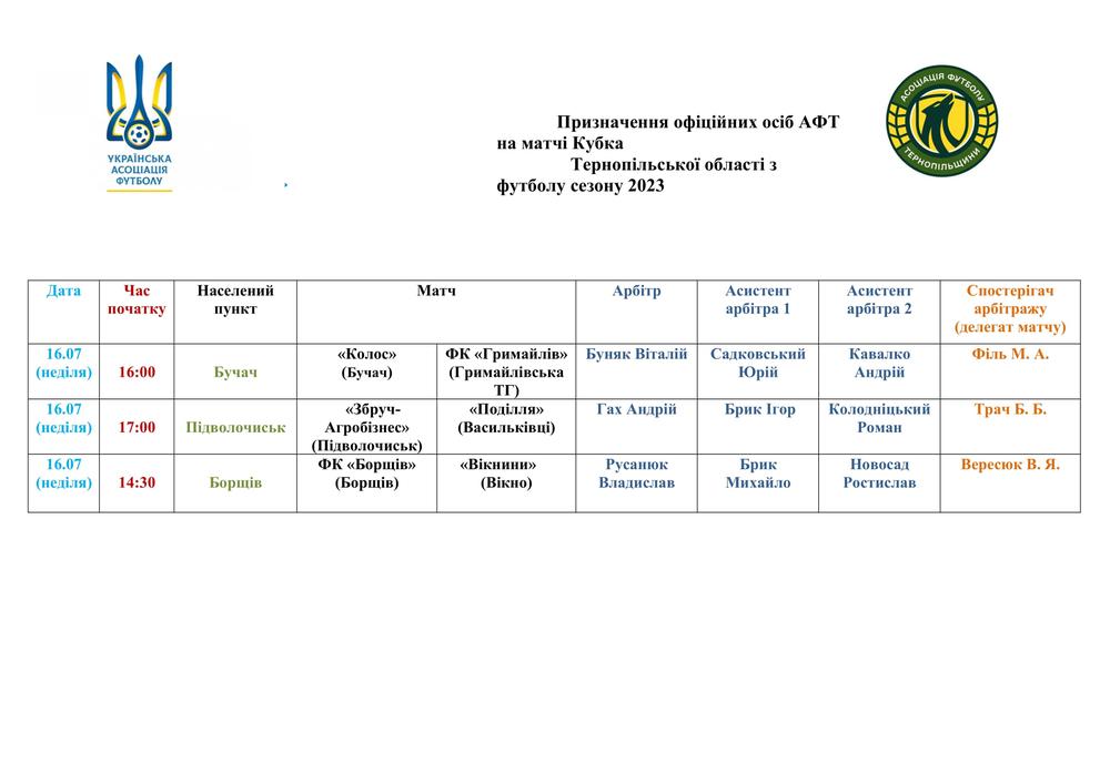 ПРИЗНАЧЕННЯ ОФІЦІЙНИХ ОСІБ АФТ НА МАТЧІ 16 ЛИПНЯ