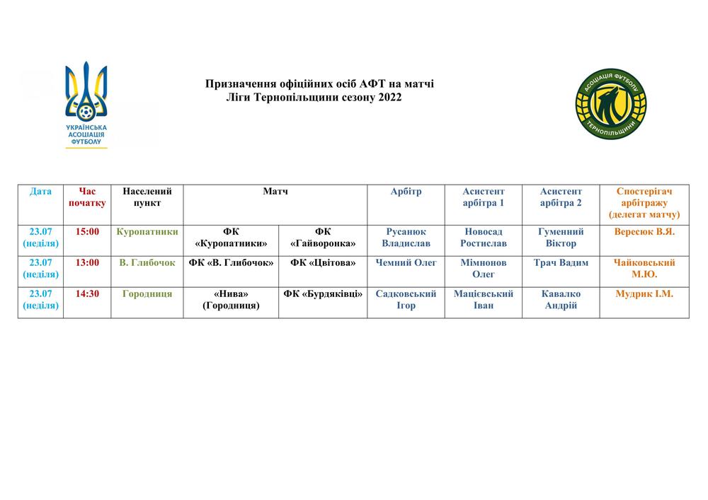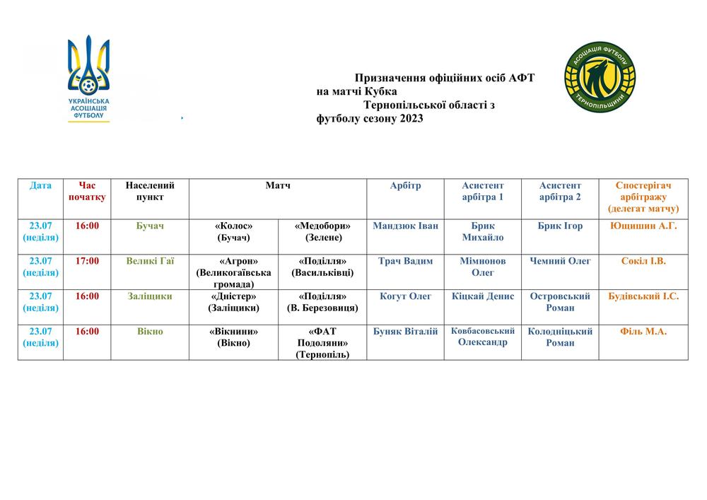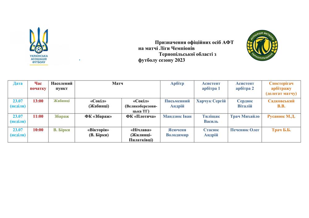 ПРИЗНАЧЕННЯ ОФІЦІЙНИХ ОСІБ АФТ НА МАТЧІ 23 ЛИПНЯ