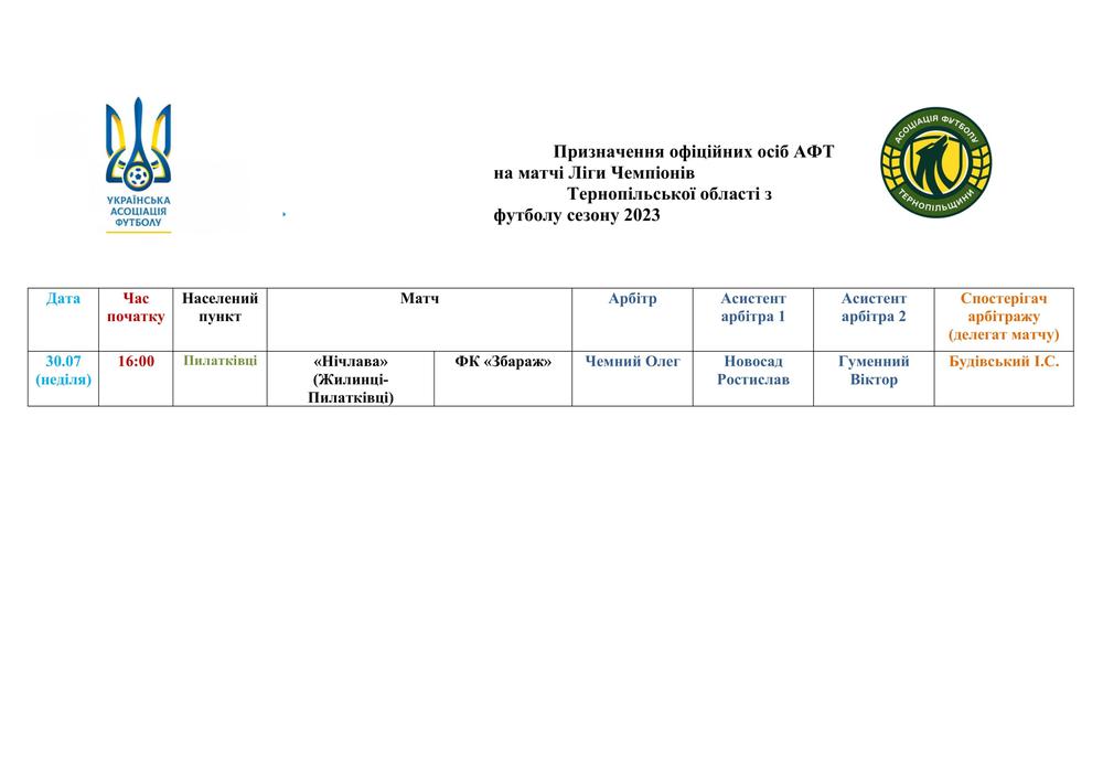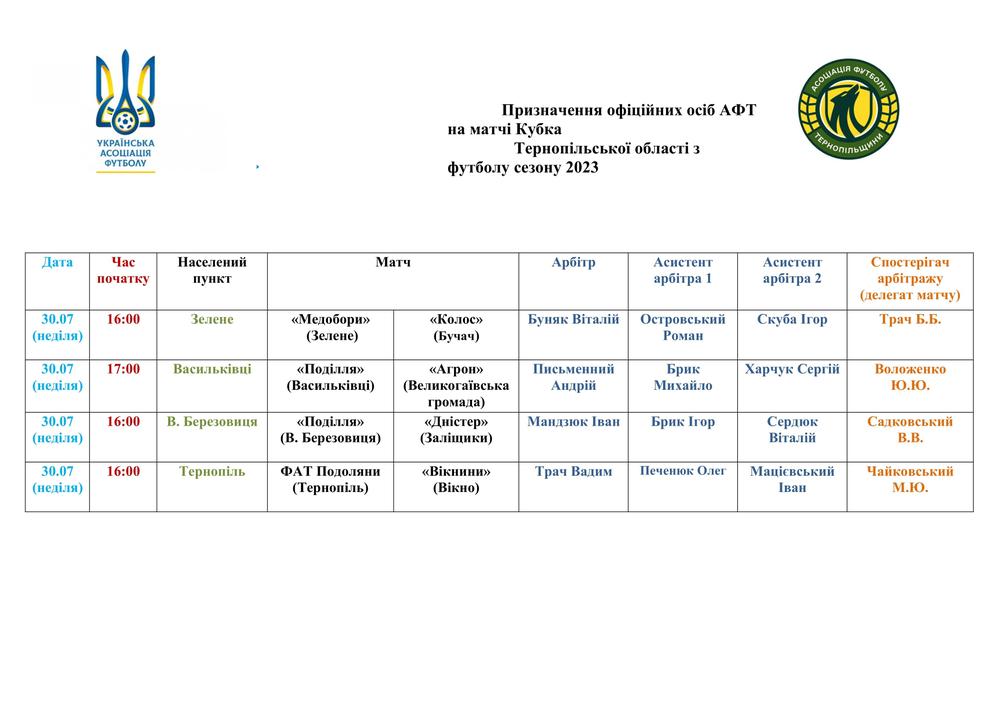 ПРИЗНАЧЕННЯ ОФІЦІЙНИХ ОСІБ АФТ НА МАТЧ 30 ЛИПНЯ