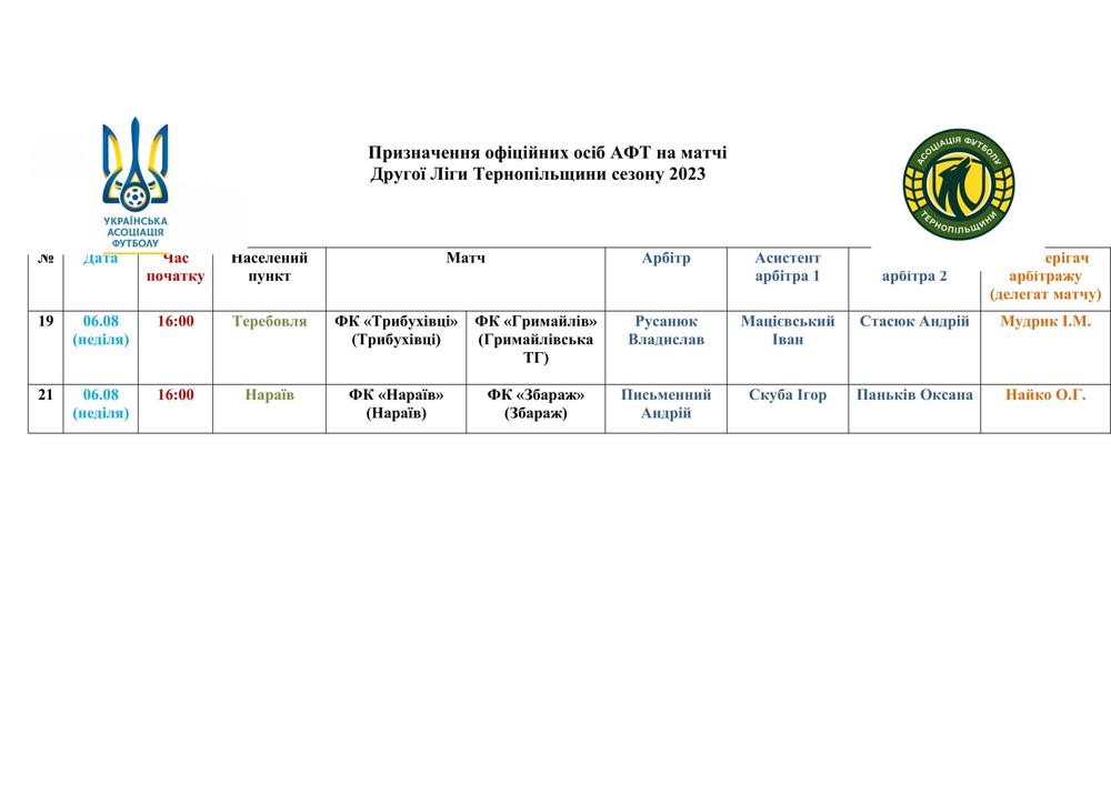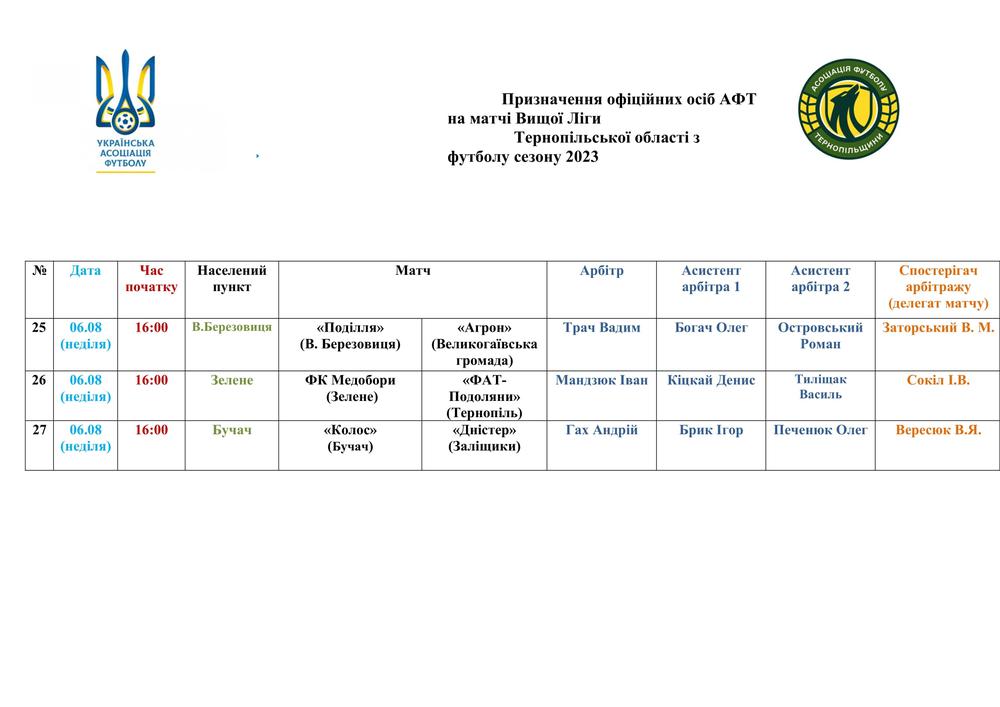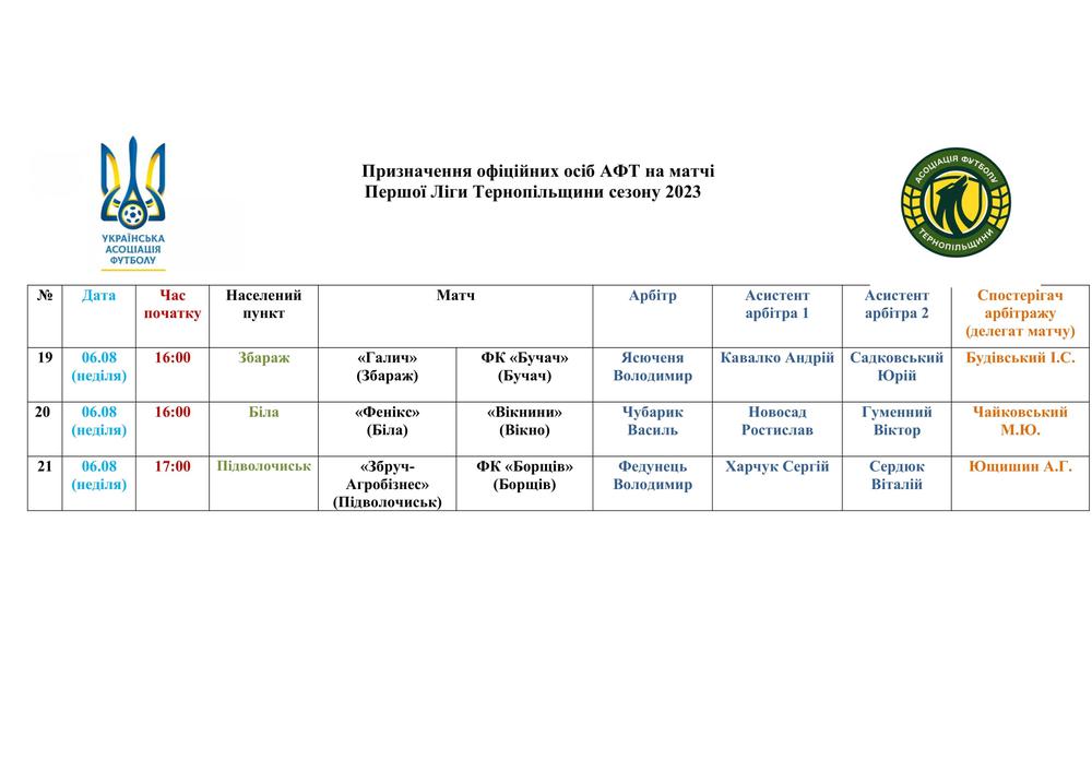ПРИЗНАЧЕННЯ ОФІЦІЙНИХ ОСІБ АФТ НА МАТЧІ ЧЕМПІОНАТУ ОБЛАСТІ 6 СЕРПНЯ
