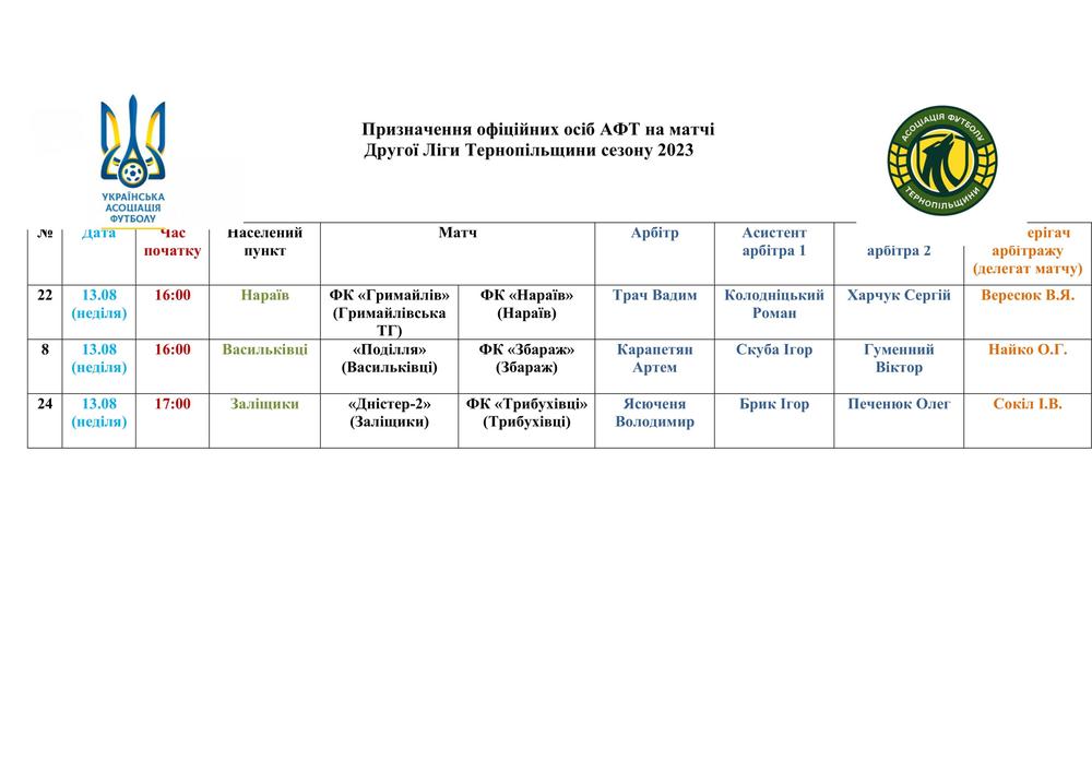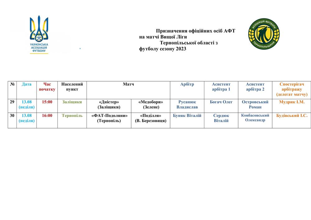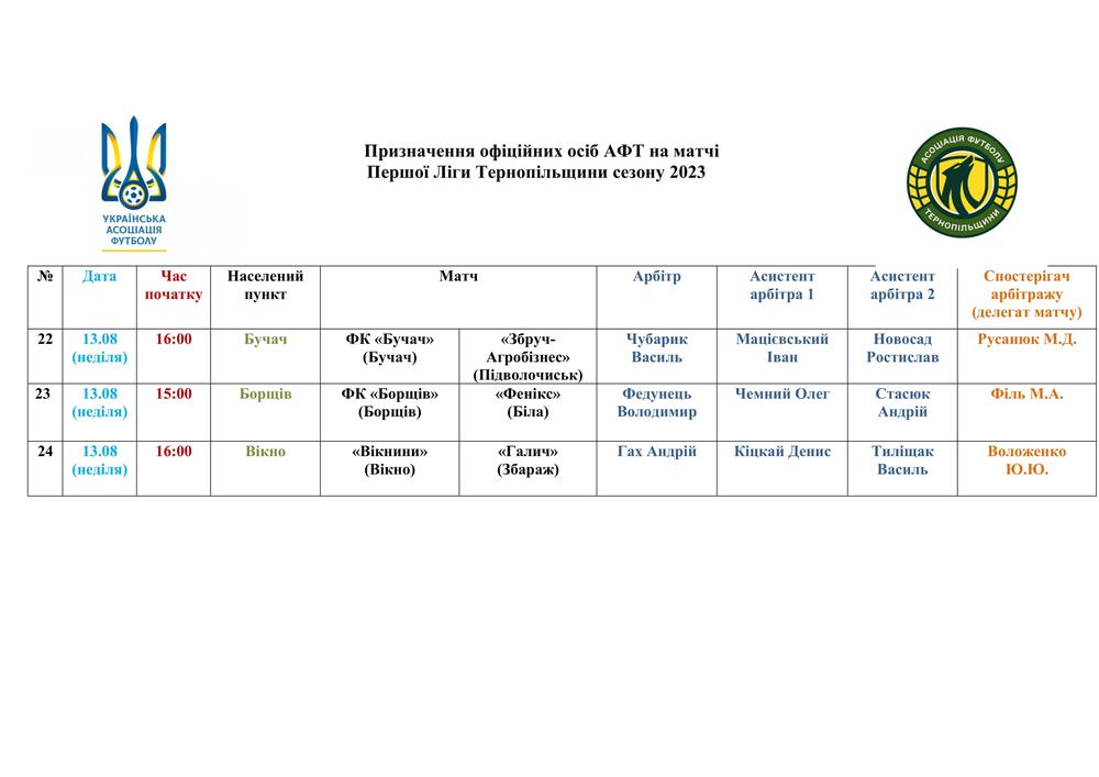 ПРИЗНАЧЕННЯ ОФІЦІЙНИХ ОСІБ АФТ НА МАТЧІ 13 СЕРПНЯ